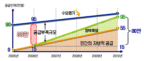 물론 민간분야의 활동이 전혀 없는 것은 아니다. 오히려 사회서비스 분야는 최근 5년 동안 노동시장을 주도해왔다. 2001~2005년 평균 취업자는 해마다 32만 명이 늘었다. 이 가운데 절반에 가까운 14만 6000명이 사회서비스 분야에 생긴 것이다.