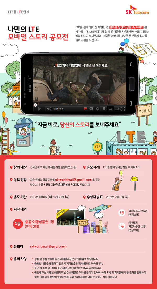 SK텔레콤(대표이사 사장 하성민, www.sktelecom.com)은 6월 4일부터 29일까지 약 4주간에 걸쳐 4G LTE 서비스를 통해서 경험한 재미있는 사례 ‘나만의 LTE 모바일 스토리 공모전’을 진행한다.