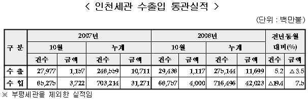 2008년 10월 인천세관의 수출통관 실적은 29,438건 11억17백만 달러로 전년 동월대비 수출건수 5.2%증가, 금액은 3.5%감소했다.