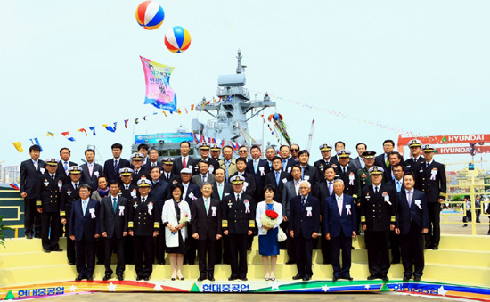 이날 이 호위함은 인천광역시의 이름을 따 「인천함」으로 명명된 후, 문은숙 여사에 의해 진수됐다. 인천함은 단거리 대공(對空) 유도탄, 속사포와 장거리 대함(對艦) 유도탄, 함포, 대잠(對潛) 헬리콥터 및 어뢰 등의 무장(武裝)을 탑재하고 있으며, 대공,대함,대잠전 전 분야에 걸쳐 공격 및 방어능력이 대폭 향상된 차세대 함정이다. (사진:인천함 진수식(2): 현대중공업 이재성 사장(앞줄 왼쪽 다섯 번째), 김성찬 해군참모총장(앞줄 왼쪽 여섯 번째), 문은숙 여사(앞줄 왼쪽 일곱 번째)