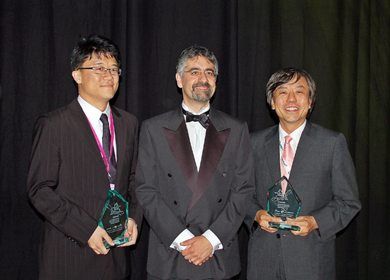 (사진설명 : 27일(현지시간) 영국 런던에서 열린 ‘스몰 셀 인더스트리 어워드’에서 ‘데이터 펨토셀’의 세계 최초 상용화를 통해 ‘혁신적인 상용화 기술’ 부문을 수상한 SK텔레콤의 천현수(사진 왼쪽) 매니저, ‘스몰 셀 포럼’의 사이몬 손더스(가운데) 의장, 콘텔라사의 권장안 이사. )