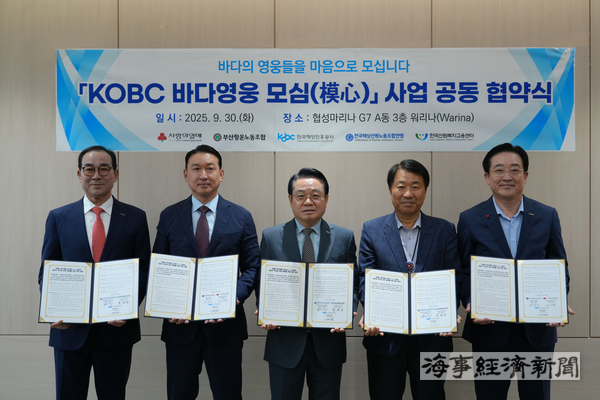 한국해양진흥공사(사장 안병길)는 9월 29일 부산 협성마리나 G7 내 코비씨 워리나에서 전국해상선원노동조합연맹, 한국선원복지고용센터, 부산항운노동조합, 부산사회복지공동모금회와 상생협력 업무협약을 체결하고 ‘KOBC 바다영웅 모심’ 사업을 공식 출범시켰다.