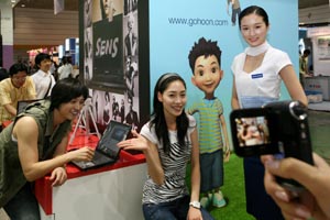 이 전시회는 20일(수)부터 23일(토)까지 서울 삼성동 코엑스에서 열린다.(사진:전시회 관람객이 삼성전자가 출시한 UCC에 적합한 캠코더로 동영상을 촬영하고 있다)