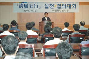 국립해양조사원(원장 연영진)은 21일 오후 해양조사원 대회의실에서 전 직원이 참석한 가운데 ‘공무원 청렴오행 실천강령’ 실천 결의대회를 개최했다.