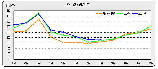 한편 2007년도 8월까지의 어업생산량 누계 기준으로는 지난해 동기대비(2,072천톤) 4.8% 증가한 2,172천톤 생산됐다.