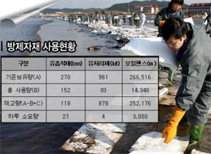 해양경찰청에 따르면 방제자재와 관련 현재 유흡착제는 4일치 사용분인 118t, 유처리제는 하루 소요량 4㎘의 200일치 분이 넘는 878㎘, 오일펜스는 252km 등을 확보하고 있어 재고상태로도 당분간의 방제활동은 충분하다.