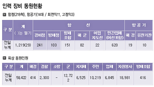 동원된 인력도 해경 414명, 경찰 2300여명과 자원봉사자 1만8981명 등 총 5만 8422명이다. 공무원과 일반시민들로 구성된 자원봉사자들이 하루가 다르게 늘어나고 있다. 각 지자체 자원봉사센터마다 봉사자를 실어 나를 차량을 이미 준비해 두고 있다.