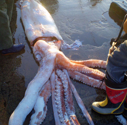 경북 영덕군 인근 해상에서 14일 오전 조업중이던 어선에 의해 초대형 오징어(길이 약6미터)가 잡혔다.