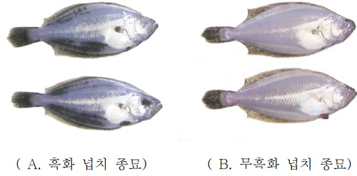 이에 따라 서해수산연구소에서는 공동 연구기관인 육종연구센터와 더불어 넙치 종묘의 품질 고급화 및 우량품종의 생존율 증진과 연안의 서식 고유 토종넙치의 형질 보존을 목적으로 방류효과의 저해요인으로 나타나는 흑화 넙치 생산을 억제하는 기술을 2006년 12월부터 시작하여, 현재까지 전장 8cm 이상의 종묘에서 흑화를 10% 이하로 차단할 수 있는 “흑화발현 제어기술” 개발에 성공하게 되었다.