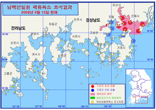 국립수산과학원은 14일에서 15일까지 진해만 및 통영일원에 대한 패류독소조사 결과, 통영시 지도 및 원문, 거제시 고현 등 일부해역을 제외한 진해만 전 해역의 진주담치에서 마비성패류독소가 검출됐다.
