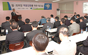 이번 워크샵은 공단출범 1주년을 맞아 팀 · 지부장의 역할 강화와 공단의 위상에 걸 맞는 팀,지부장의 가치관 확립을 통해 새로운 공단 발전 전략을 모색하기 위해 마련되었으며, 임광태 전략경영실장의 “경영성과 및 미래 발전전략” 에 대한 특강에 이어 “나는 팀 · 지부를 이렇게 운영하겠다.”라는 주제로 팀,지부장간 자유토론을 통해 효율적인 팀,지부 운영과 더불어 공단발전을 위한 역할 모델을 제시했다.