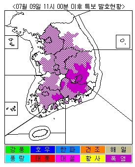 9일 서울과 경기, 광주, 호남 및 영남 내륙지방과 대전을 포함한 충남 내륙지방으로 폭염특보가 확대되는 등 찜통더위가 기승을 부리고 있어 건강관리에 특별한 주의가 요구된다.