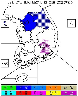 현재 호우주의보는 경기 및 강원 일부와 서해5도, 서울시에 내려져 있고, 호우경보는 경기 김포시, 동두천시, 포천시, 가평군, 고양시, 양주시, 의정부시, 파주시, 인천광역시에 각각 발효중이다.