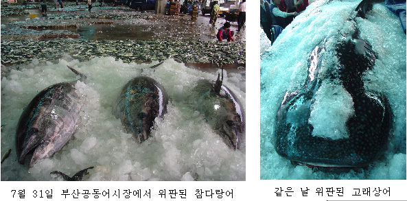 올해 들어 참다랑어의 어획량이 증가하고 있는 가운데 이번에는 체장 2미터가 넘는 대형 참다랑어 3마리가 제주도 서방해역에서 대형선망어선에 의해 어획됐으며, 아울러 우리나라에서는 드물게 출현하는 고래상어 2마리가 근해안강망어선에 의해 여수 앞바다에서 어획되어 부산공동어시장에서 위판됐다.