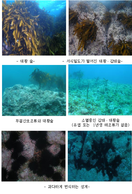 대황 · 감태가 군집을 이루고 있는 장소에 대해 정밀 조사한 결과, 수명을 다한 대황,감태숲의 약 절반정도는 유엽 및 1년생으로 추정되는 어린 해조류가 거의 없어 대황,감태가 지속적으로 재생산되어 바다숲을 유지하는데 문제가 있을 것으로 추정됐다.
