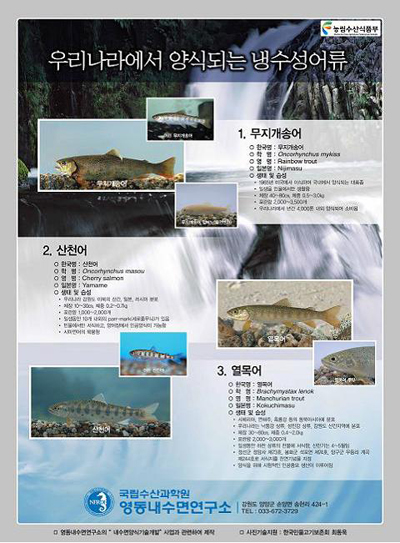 국립수산과학원 영동내수면연구소(소장 공용근)에서는 우리나라 민물고기 중 현재 양식되고 있는 냉수성어류를 한눈에 비교할 수 있도록 생태 및 습성 그리고 간단한 양식현황과 특징들에 대하여 기술하고 성장 단계와 특징적인 부분을 사진으로 표현한 포스터를 만들어 일반인들이 쉽게 이해할 수 있도록 했다.