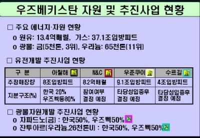 최근 우즈베키스탄 자원에 대한 일본·유럽 등 선진국의 관심이 증가하고, 일본 고이즈미 총리가 29~30일 국빈방문 중 이루어졌다는 점에서 그 성과가 더욱 부각되며, 최근 우라늄 국제가격 급등으로 원전연료의 안정적 확보방안에 대한 우려가 제기되고 있는 가운데, 이번 정 장관 방문에서 잔타우르 우라늄광을 대한광업진흥공사가 개발할 수 있도록 우즈벡 지질위원회와 합의, 우라늄 협력을 본격화 하는 한편, 우즈벡내 여러 자원개발 사업이 활성화할 것으로 기대된다.