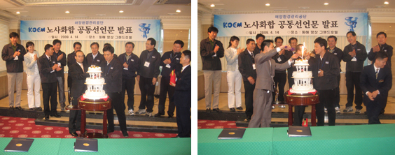 해양환경관리공단(이사장 이용우 사진左)은 지난 14일 강원도 동해시에 위치한 망상그랜드호텔 세미나실에서 공단 경영진을 포함한 노사(勞使)협의회 각 위원과 배석직원 등 33명이 참석한 가운데 워크숍을 갖고 노사 상생을 위한 '勞使 화합 공동선언문'을 발표했다.