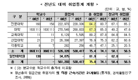 교육인적자원부와 한국교육개발원은 전국 363개 대학 및 139개 일반대학원 졸업자 561,203명을 대상으로 실시한 '고등교육기관 졸업자 취업조사'(기준일 :‘06.4.1)의 결과를 25일 발표했다.