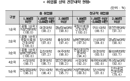 전문대학의 경우 총 취업률은 그룹별로 경남정보대학 98.6%, 대경대학 98.2%, 거창전문대학 100.0%, 국립의료원간호대학 100.0%, 남해전문대학 100.0%가 상위를 기록했고 정규직 취업률은 그룹별로 영진전문대학91.3%, 구미1대학 88.5%, 국립의료원간호대학 100.0%가 상위를 기록했다.