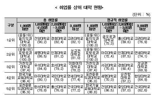 대학의 경우 총 취업률은 그룹별로 고려대학교 82.1%, 경희대학교 82.4%, 건양대학교 90.2%, 을지의과대학교 100.0%, 포항공과대학교 100.0%가 상위를 기록했다. 정규직 취업률은 그룹별로 고려대학교 76.9%, 울산대학교 69.6%, 금오공과대학교 73.3%, 을지의과대학교 100.0%, 포항공과대학교 100.0%가 상위를 기록했다.
