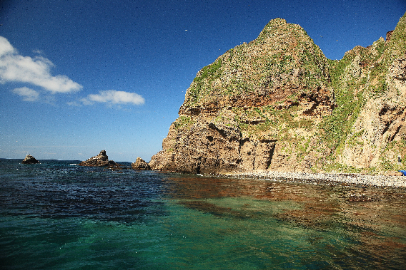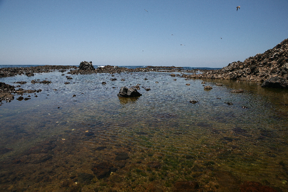 또, 이번조사에서는 연안에서 보기 힘든 띠볼락 뿐만 아니라, 개볼락, 도화볼락, 불볼락, 볼락, 우럭볼락, 조피볼락 등 여러종류의 볼락류가 관찰되었고, 또한, 전장 50cm 이상되는 대형크기의 찰가자미와 더불어 줄가자미, 홍어 등도 어획되었다. (사진:독도 해역의 조간대 모습)