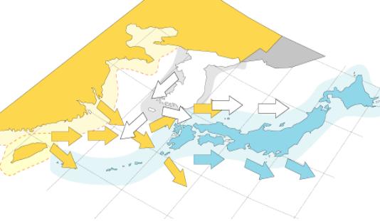 작년 경우 해안가쓰레기 수거처리를 위해 96억원을 들여 전국 50개 지자체 369개소 연인원 15만 4016명을 동원하여 6328톤을 수거했다.(사진:해양쓰레기 이동 경로)