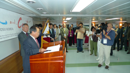 이 외교회의는 IMO 미트로풀로스(Mitropoulos) 사무총장과 STCW 협약 134개 당사국 대표 및 기타 국제민간기구(NGO) 대표들이 참가하는 범세계적인 회의이다. (사진:한국해양대 실습선 한바다호에서 열린 2012 여수엑스포 홍보전에서 오 총장이 인사말을 하고 있다)