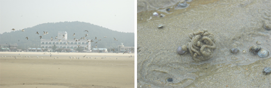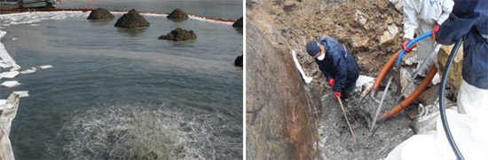 (사진:2007년 12월 7일 태안 앞바다에서 발생한 최악의 유류오염사고 후 천리포해안에서 에어제트에 의해 침전된 유류를 부상시키고 있는 가운데 우측 사진은 물이없는 바위에 붙어 있는 기름띠를 세계최초의 오염제거방법인 에어제트에 의해 제거하고 있다)