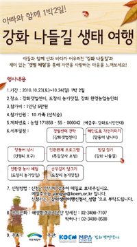 국토해양부가 주최하고 해양환경관리공단 및 강화갯벌센터가 공동 주관하게 될 이번 갯벌 생태여행은 강화도에서 10월 23일~24일, 1박 2일 동안 진행된다.