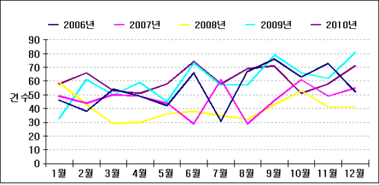 지난 5년간 3월은 연중 두 번째로 사고가 적은 달이었으나, 충돌사고 발생비중이 전체의 26.3%(62건)로 월평균 충돌사고 발생비중(24.4%)보다 높았으며, 전복사고는 11월(11건)에 이어 연중 두 번째로 빈발(10건)하였고 주로 어선에서 발생한 것으로 나타났다.