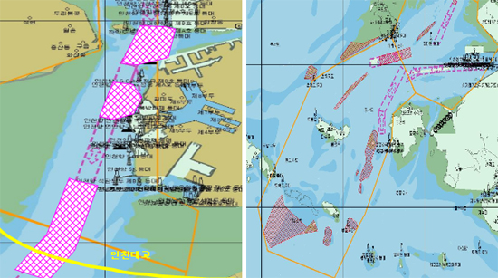 인천항을 운항 중인 선박이 미리 설정된 혼잡구역(남항입구, 갑문입구, 북항입구),저수심 구역[그림참조] 접근 및 혼잡구역내 선박항행의 위험 우려가 예상될 경우, 관제센터에서는 해당선박에 장착된 AIS단말기에 항행안전정보 문자메시지 및 VHF 무선전화를 통한 음성방송을 동시에 실시할 예정이다. (사진:인천항 혼잡구역 및 저수심 구역 설정)