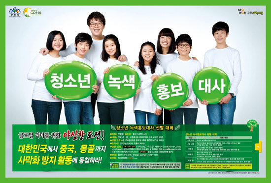 산림청(청장 이돈구)이 전국 초(4학년 이상)·중·고교생을 대상으로 청소년 녹색홍보대사를 선발한다. 오는 10월 경남 창원에서 아시아 최초로 열리는 유엔사막화방지협약(UNCCD) 제10차 당사국 총회를 200여일 앞두고 청소년들에게 사막화 방지의 중요성을 일깨우고 범세계적인 사막화 방지운동에의 참여를 유도하기 위한 취지에서다.