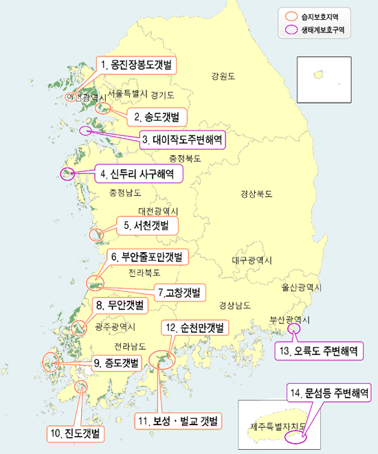 이 조사의 결과를 바탕으로, 연안습지(갯벌)를 비롯한 해양생태계 및 해양경관 등을 특별히 보전할 필요가 있는 구역을 해양보호구역으로 지정ㆍ관리하고 있으며, 현재까지 총10개의 습지보호지역과 총4개의 해양보호구역이 지정됐다.