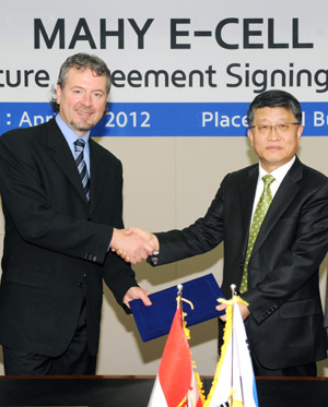 (사진:2일(월) 현대중공업 서울 계동사옥에서 열린 전기차 배터리 공동개발 조인트벤처 설립 서명식. 현대중공업 이충동 부사장(오른쪽, 그린에너지사업본부장)과 매그너 이카社 CFO인 존 시모네띠(John Simonetti)씨가 서명 후 악수하고 있다.)