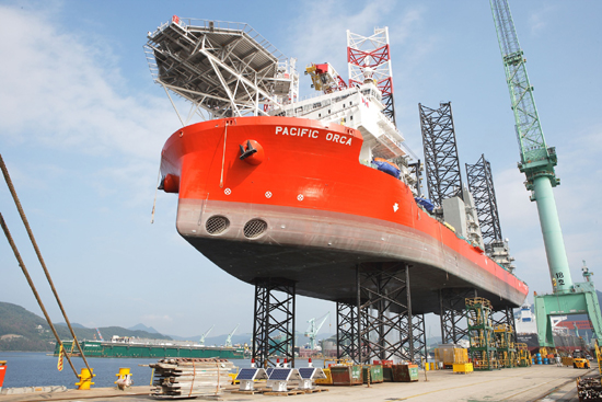 삼성중공업은 세계 최대 크기의 해상풍력발전기 설치선 (WIV, Windfarm Installation Vessel)인 'PACIFIC ORCA'호의 건조를 성공적으로 마치고 선주사인 싱가포르 SPO(Swire Pacific Offshore)社에 인도했다고 25일(수) 밝혔다.(사진:하늘을 나는 배 삼성중공업 거제조선소에서 건조 당시 촬영한 장면. 잭업레그를 내려 선체를 들어올린 모습이 이채롭다.)