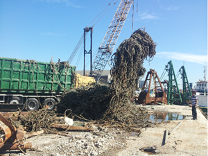올해 수거한 해양쓰레기는 34톤이었다. 2008년부터 2012년까지 총 229톤의 해양쓰레기를 수거했다. < 사진:수거한 침적쓰레기의 상차 모습 >