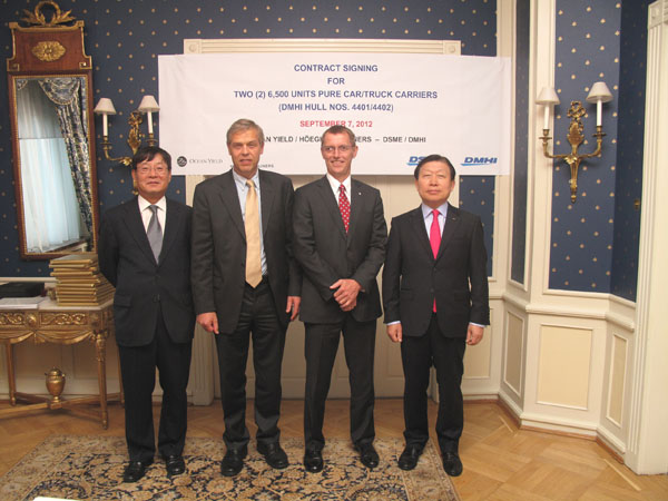 사진설명 : 지난 7일 오슬로 현지에서 열린 계약식에서 각 사 주요 관계자들이 기념촬영을 하고 있다. 오른쪽부터 대우조선해양 고재호 사장, 용선사인 회그(Hoegh Autoliner)社의 잉가 스키아커(Ingar Skiaker) 사장, 오션일드 社 라스 솔바켄(Lars Solbakken) 사장, 대우망갈리아조선소 홍순길 대표다.