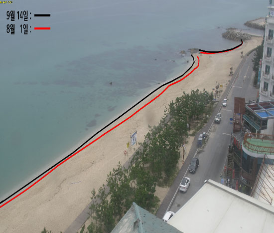 이후, 강릉시에서 복구한 양빈 모래(2,862㎥:덤프트럭 500대 분량)의 영향과 가을철로 접어들면서 우세하게 일기 시작한 북동계열 파랑에 의한 자연적 퇴적현상으로 경포대 해수욕장의 백사장은 침식발생 이전인 6월의 수준으로 점차 원상회복되고 있는 것으로 나타났다.