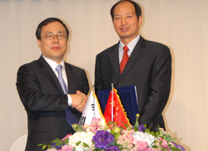 국토해양부(장관 권도엽)는 지난 10월 31일부터 양일간 부산서 20차 한중해운회담을 개최하고, 중국측과 한중항로를 운항 중인 카페리선박이 정기검사를 받는 동안 대체 카페리선을 투입할 경우, 선령 20년 이상 선박도 가능하도록 하는등, 한중해운분야의 현안을 이같이 합의했다.(사진:한중해운회담 국토해양부 전기정 해운정책관(좌)과 중국 교퉁운수부 송덕성 수운국장이 양국의 회담 수석대표로 최종 현안을 합의한 후 악수를 나누고 있다)