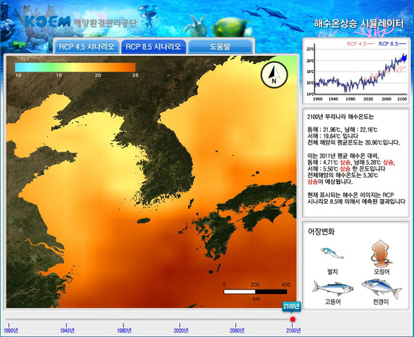 해양환경관리공단이 홈페이지(www.koem.or.kr)를 통해 제공하고 있는 ‘해수온상승 시뮬레이터’는 ‘온실가스 저감 정책이 상당히 실현되는 경우(RCP 4.5 시나리오)’와 ‘현재 추세로 온실가스가 배출되는 경우(RCP 8.5 시나리오)’로 구분하여 우리나라 주변해역의 미래 해수온도 변화를 보여주는 시스템이다.