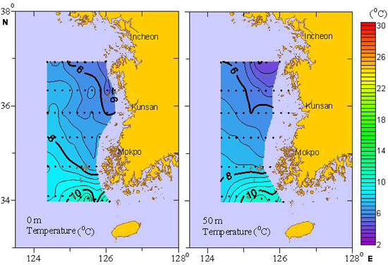 표층 수온은 4.92∼11.46℃, 50m층은 3.94∼11.77℃로 근해역과 남부해역으로 갈수록 수온이 높게 나타났다. 특히, 태안반도 북부 연안의 표층 수온은 6℃이하로 가장 낮았다.