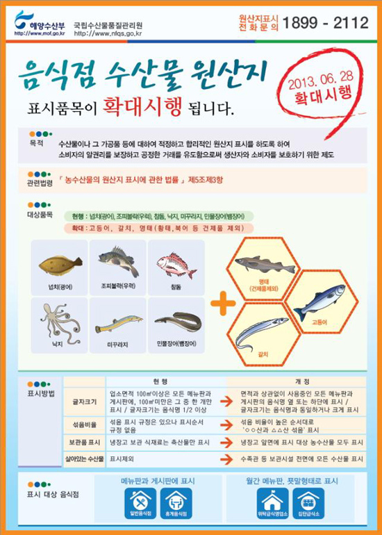 이날부터「농수산물의 원산지 표시에 관한 법률 시행령」이 개정․시행됨에 따라 음식점에서의 수산물 원산지 표시 대상품목은 기존 6개(넙치, 조피볼락, 참돔, 미꾸라지, 뱀장어, 낙지)에서 명태(황태․북어 등 건조품 제외), 고등어, 갈치가 추가되어 9개로 확대된다.