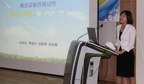 해양수산부(장관 윤진숙)은 2013년도 한국항해항만학회 춘계학술대회의 ‘해상교통관제(VTS) 특별세션’을 6월27~28일 진해 해군사관학교에서 개최했다고 밝혔다.(사진:제주 관제센터 김유순 여성관제사가 ‘해상교통관제사의 직무스트레스에 관한 연구’ 논문을 발표하고 있다.)