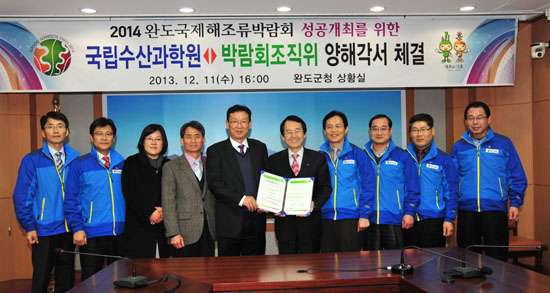국립수산과학원(원장 정영훈)은 2013년 12월 11일 완도군청에서 세계 최초로 개최되는 ‘2014 국제해조류박람회’의 성공적인 개최를 위해 완도군과 양해각서를 체결했다고 밝혔다.