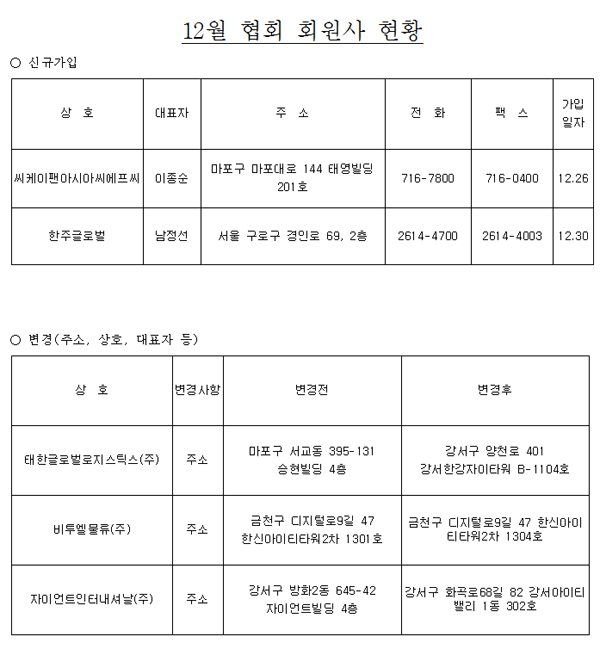 한국국제물류협회 12월 협회가입 현황