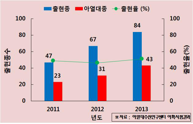 또한, 아열대수산연구센터는 2011년부터 제주 연안의 아열대 어종 출현 조사를 실시한 결과 ▲2011년 48% ▲2012년 46% ▲2013년 51%를 아열대 어류가 차지하는 등 해마다 이들의 출현율이 증가하는 것으로 조사됐다.