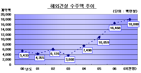건교부는 내년에도 수주 상승세가 지속돼 180억달러 이상을 수주할 것이며, 우리 기업들의 수주경쟁력과 세계 시장상황 등을 고려할 때 향후 연간 150억~200억달러대의 수주를 지속할 것으로 내다봤다.