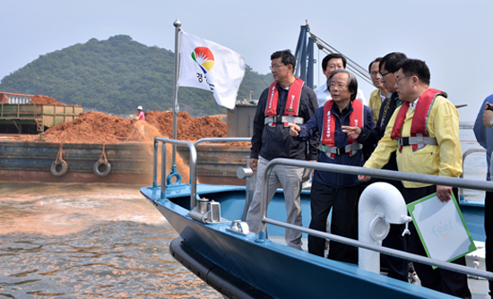 지난달 31일 적조주의보 발령(고성군 일대)일부터 9월 10일까지 적조 피해액은 17억5000만 원이며, 이 중 추석연휴에만 15억 원의 피해가 발생했다. (사진:추석 연휴 마지막 날인 10일 이주영 해양수산부장관(왼쪽에서 두번째)이 경남 남해군 미조면 적조피해 어장의 방제 현장을 점검하고 있다)