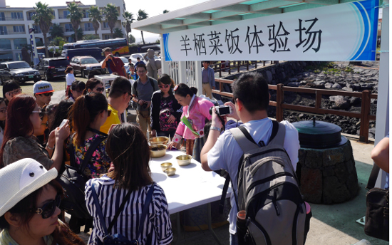 해양수산부(장관 이주영)는 올해 어촌체험마을 외국인 관광객 유치목표인 2,000명을 10월 중에 달성하여 연말까지는 약 2,500명의 외국인 관광객이 어촌체험관광을 할 것으로 전망된다며, 내년에는 4,000명 이상의 외국인 관광객이 어촌체험관광을 즐길 수 있도록 하겠다고 밝혔다.(사진:지난 10월 초 제주 애월읍 구엄어촌체험마을에 요우커(중국인 관광객) 어촌체험관광객이 해녀문화체험의 하나인 톳밥만들기 설명을 듣고 있다.)